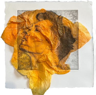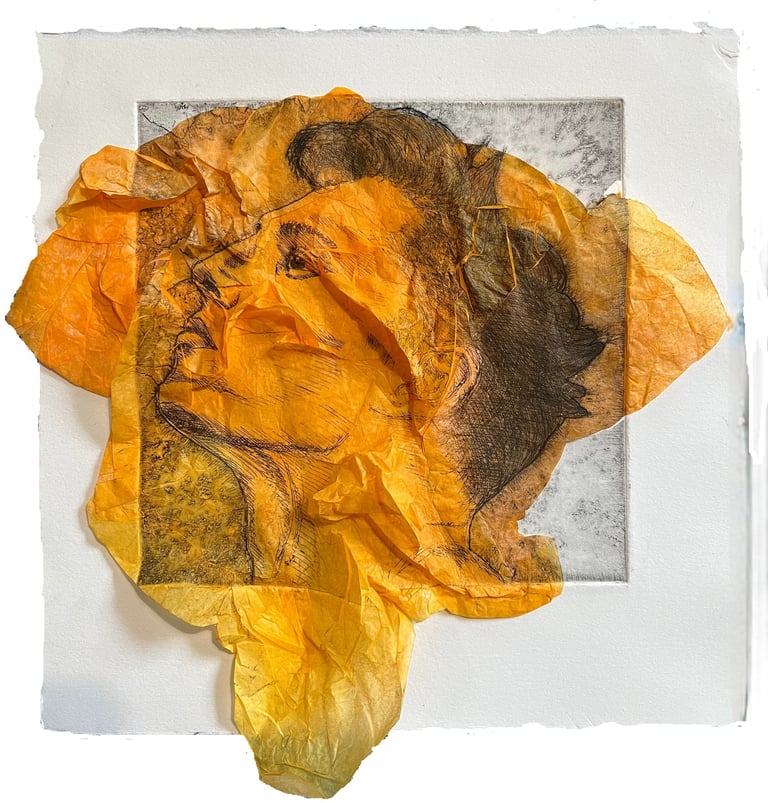 Eau-forte, imprimée en noir avec collage de papier de soie teinté et froissé