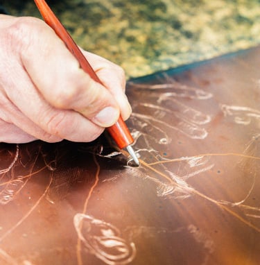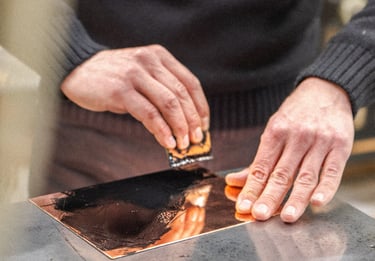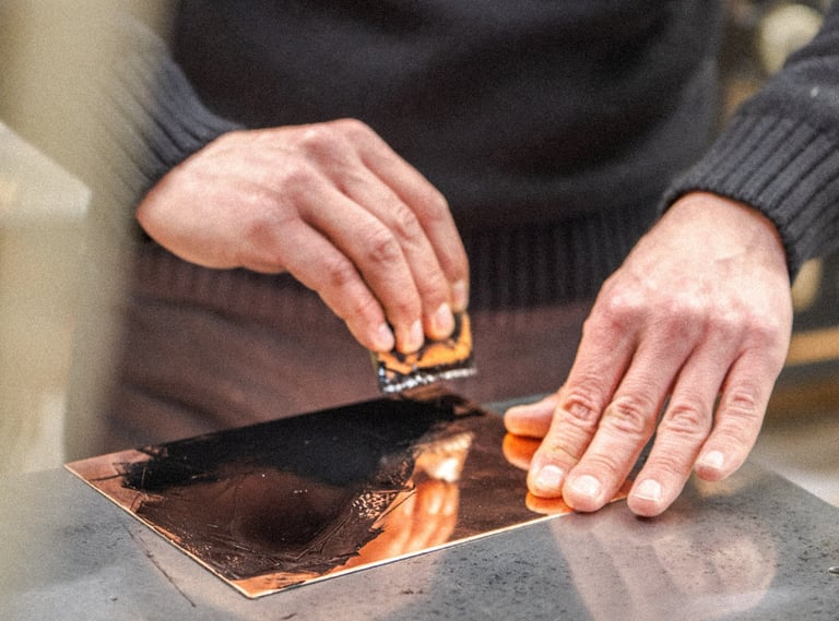 Tout commence par une surface nue : une plaque de cuivre que je nettoie, polis, apprête.