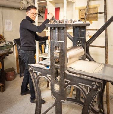 La plaque est posée sur la presse, recouverte d’un papier d'art humidifié.