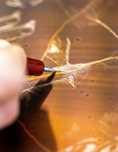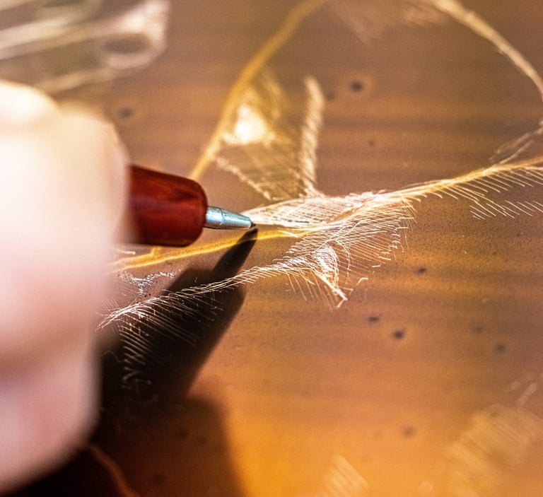 De près, les traits apparaissent comme des éclats de lumière : ce sont eux que l’acide viendra creuser.