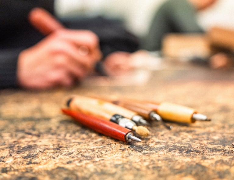 Les roulettes, brunissoirs, grattoirs et pointes reposent comme des instruments de musique avant le concert.