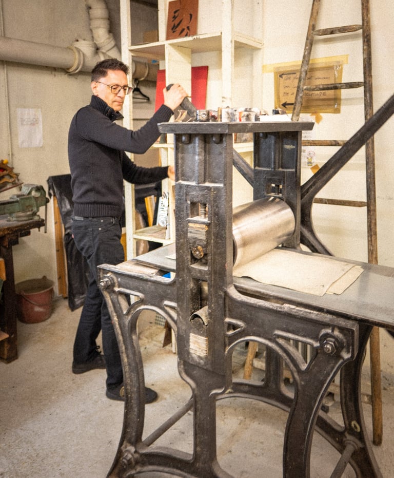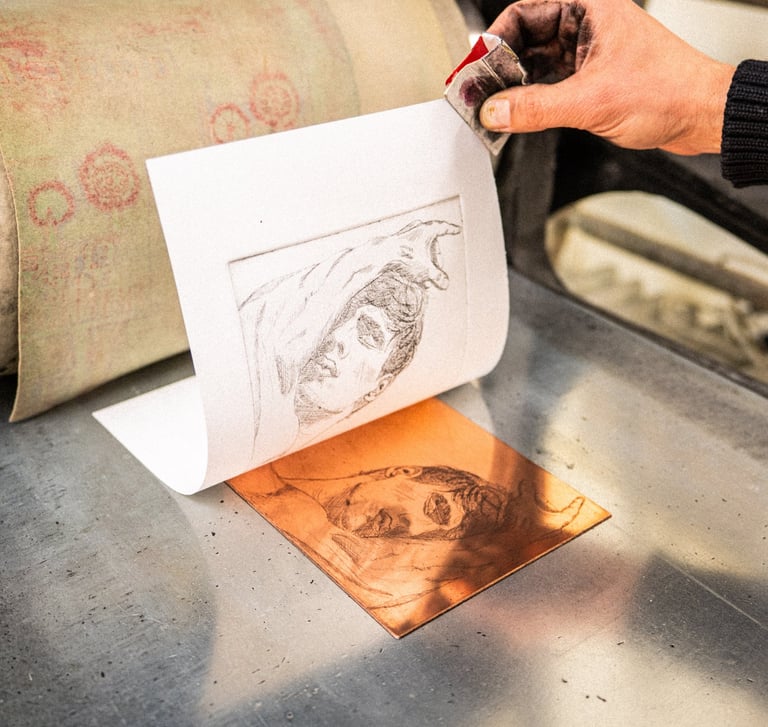 Quel plaisir, et quel honneur, d’imprimer sur la presse qui fut celle d’Hayter — et, dit‑on de bouche à oreille, touchée aussi par les mains de Miró et de Picasso. Chaque passage sous le rouleau porte alors un peu de leur souffle, un écho discret de leur geste.