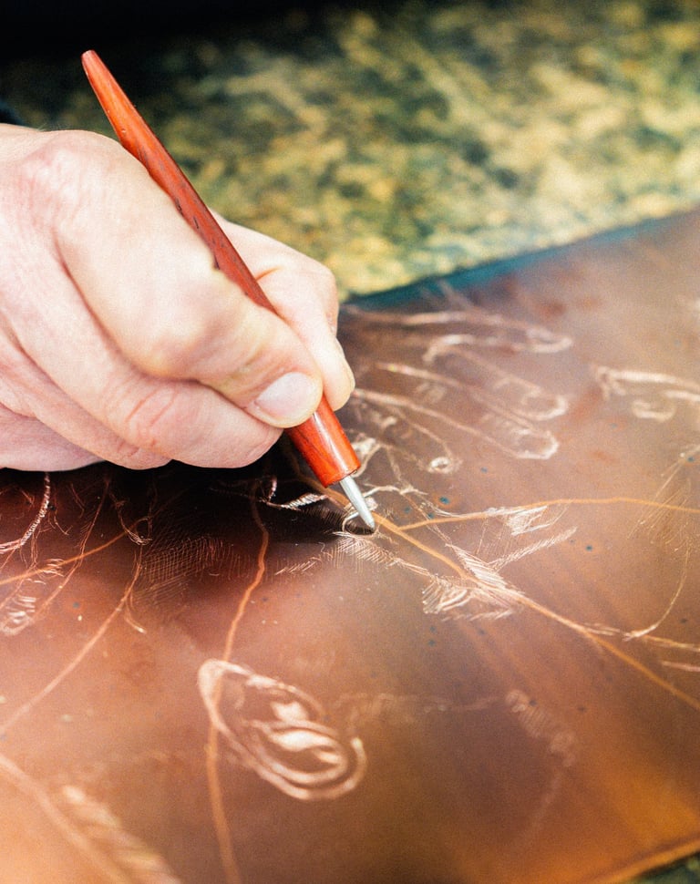 On y voit le dialogue entre la matière et le geste, entre le cuivre et le papier.